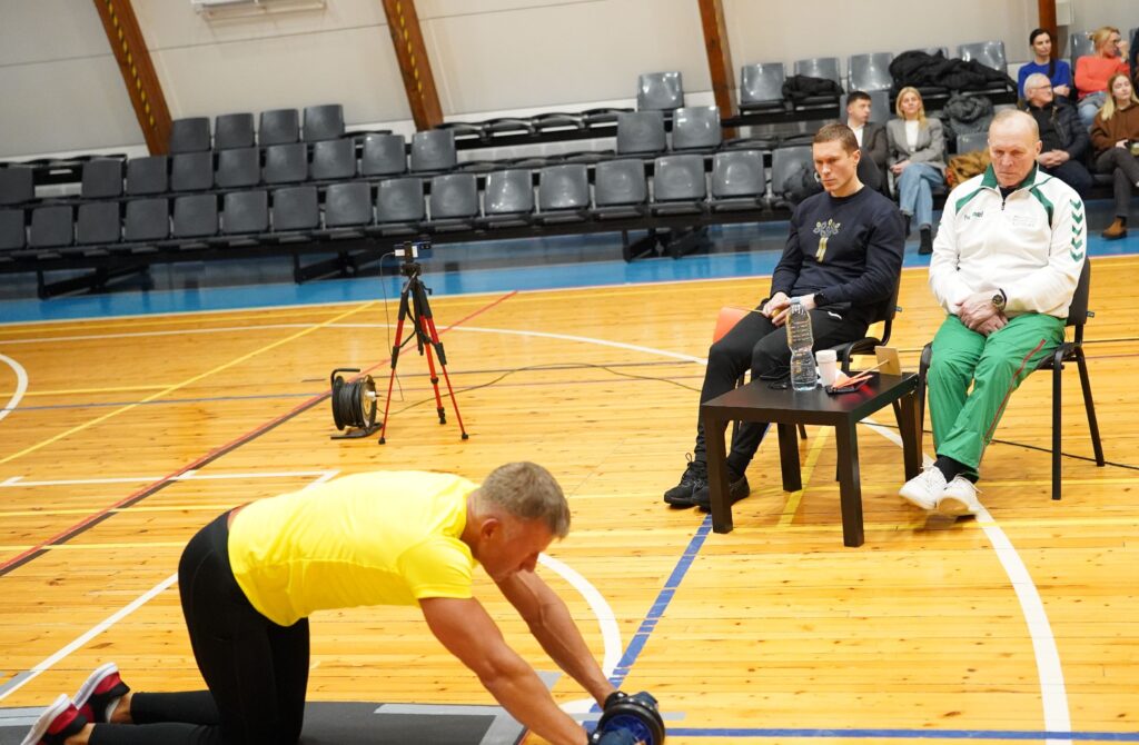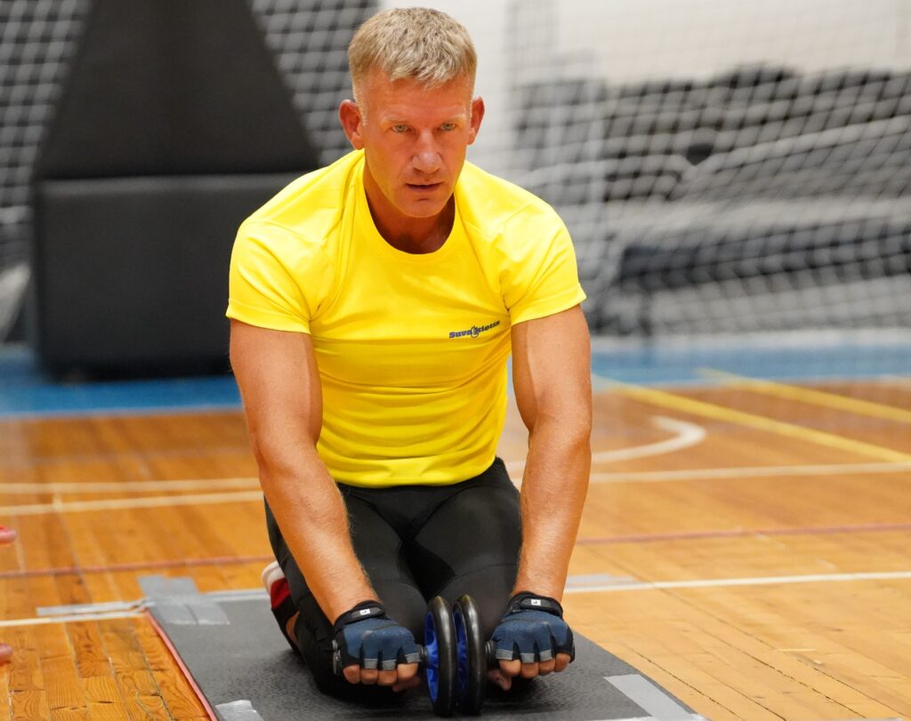 Daugiausia per 1 val. atliko išsitiesimų su pilvo raumenų stiprinimo ratuku – 989 išsitiesimus – atliko Mantas Varaška Kazlų Rūdos sporto centre 2026 m. vasario 23 d. Pratimas atliktas atsiklaupus ant kelių ratuką ridenant pirmyn iki visiškai ištiestų rankų, krūtine paliečiant grindis, ir grįžtant atgal iki pradinės padėties.
