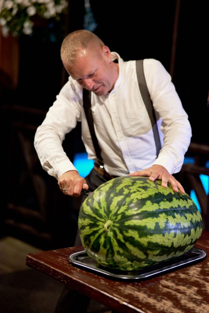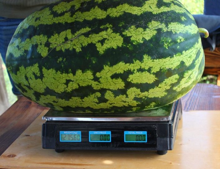 Didžiausias arbūzas – 27,56 kg masės, 65 cm ilgio, 51,5 cm aukščio, 109 cm apimties – išaugintas Nelijaus Zaleckio iš Gabriliavos (Elektrėnų sav.) darže po atviru dangumi 2024 m.
