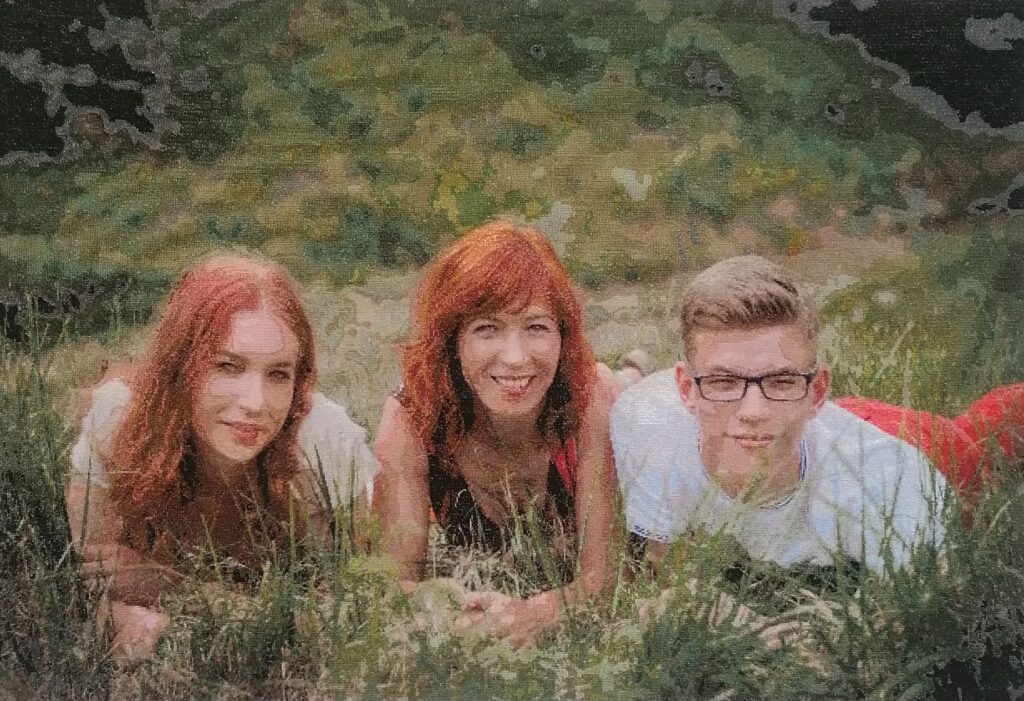 T. Dulinskienė kryželiais išsiuvinėjo savo ir savo vaikų portretą pievoje.
