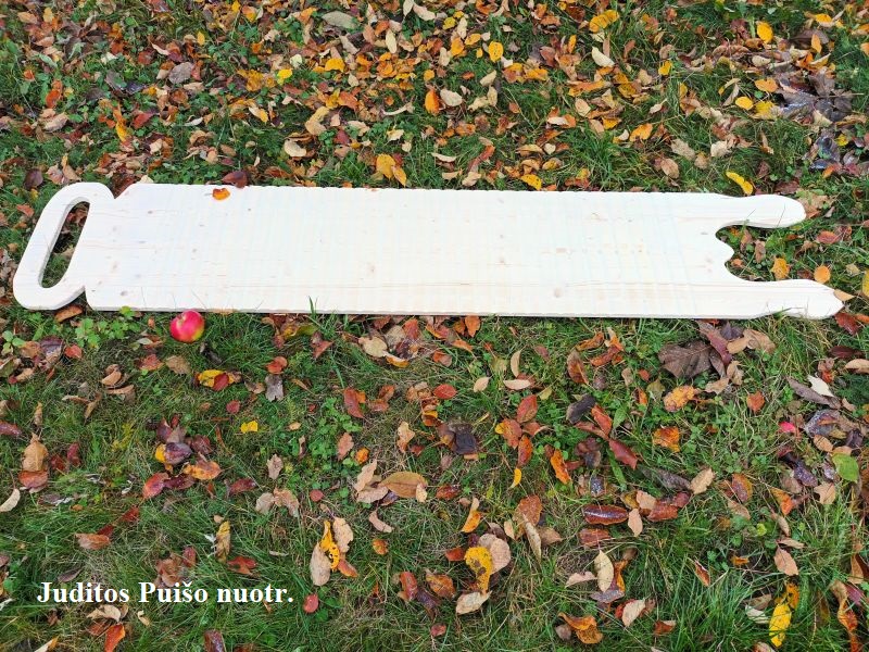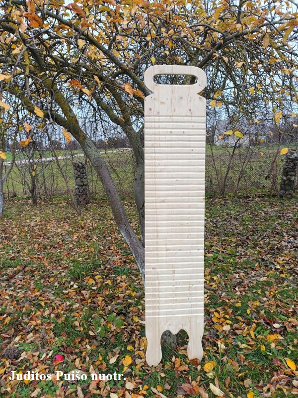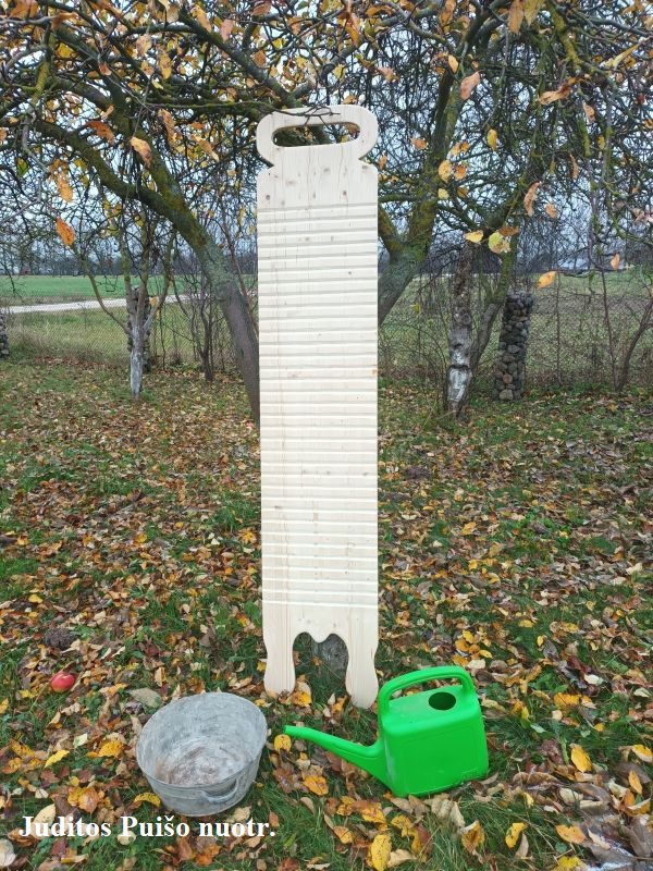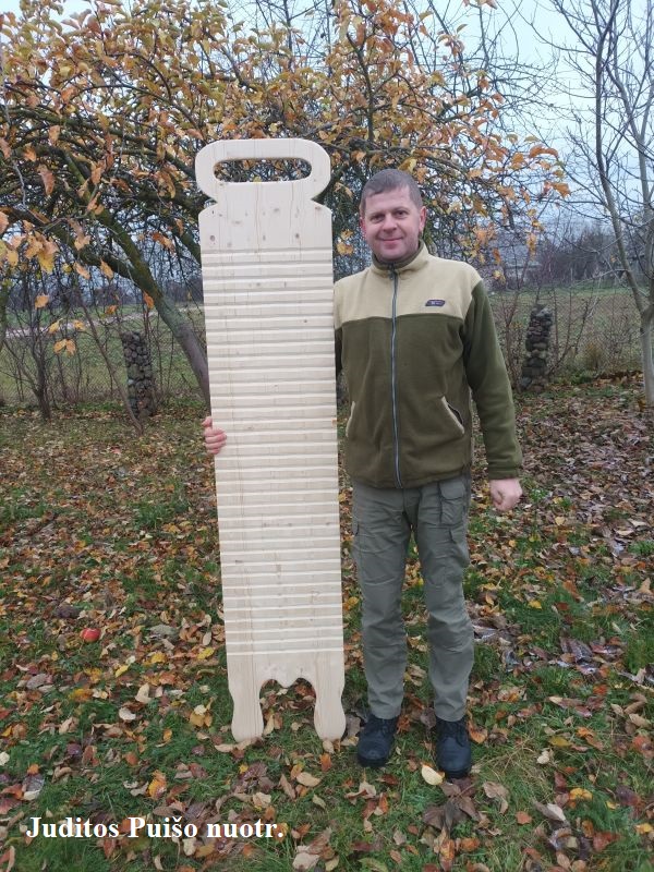 Didžiausias skalbinių trintuvas – 2 m ilgio, 40 cm pločio, 1,8 cm storio – išdrožtas tautodailininko Artūro Narkevičiaus iš eglės medienos 2023 m.