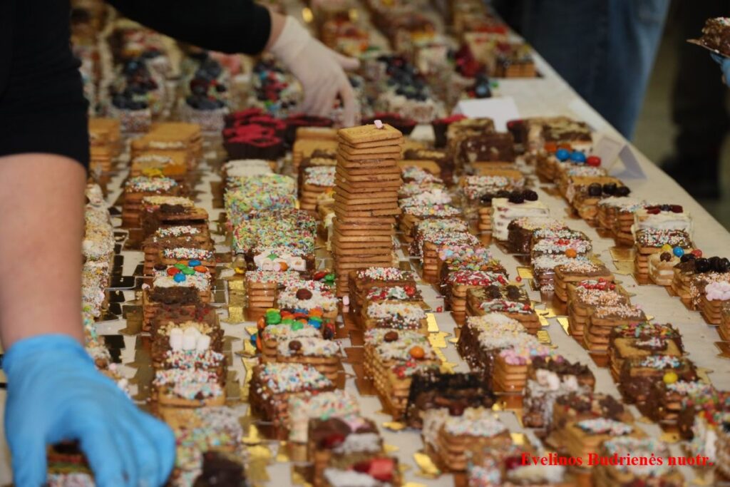 Sausaininių pyragaičių eilei sudėlioti sunaudota 102,42 kg sausainių, 41,4 kg tepamo kremo su lazdynų riešutais ir kakava, 40,2 kg karamelizuoto sutirštinto pieno, 39 kg desertinės varškės, 15 kg sviesto, 18 kg žemės riešutų kremo, 1,92 kg cukrinių pabarstukų.