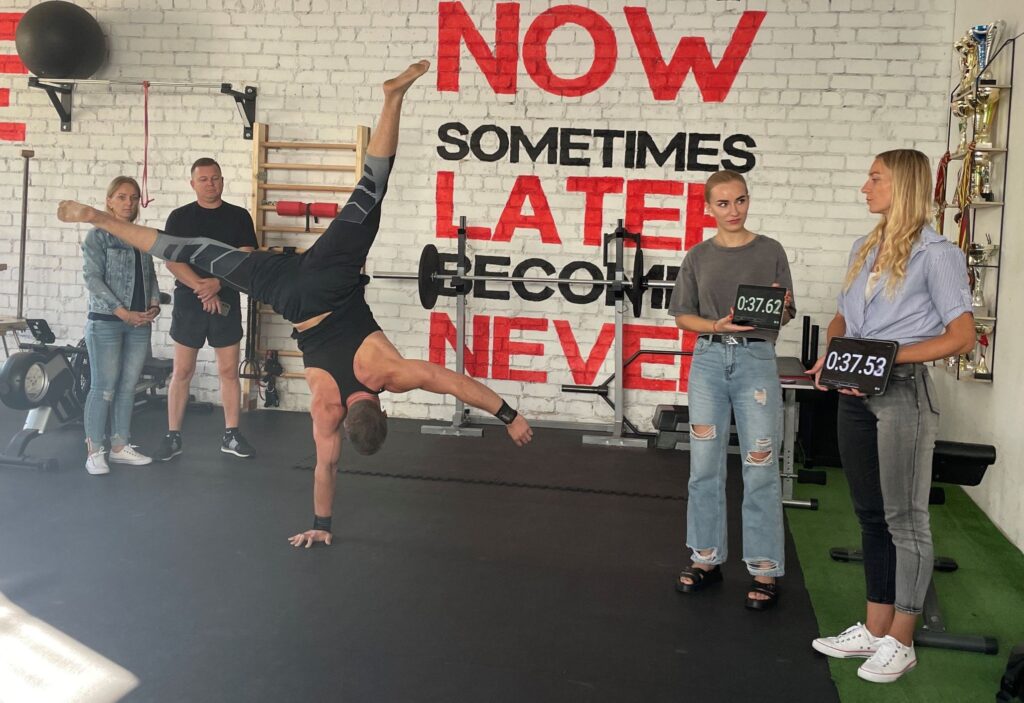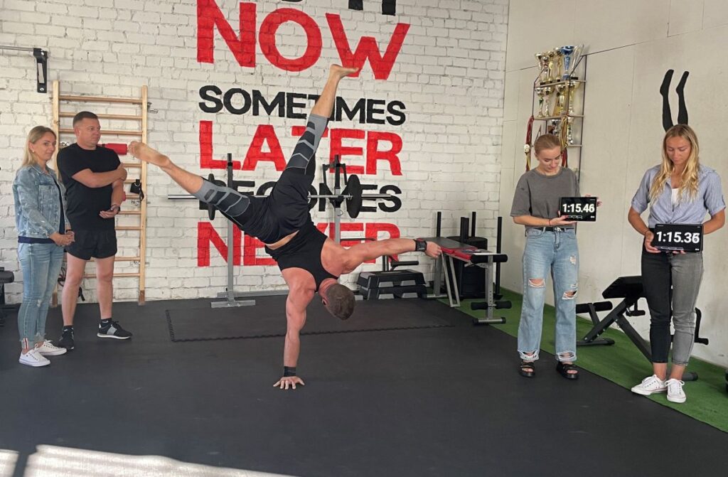 Ilgiausiai stovėjo ant vienos rankos – 1 minutę 16,5 sekundžių – išstovėjo kupiškėnas Marius Praniauskas Kaune 2024 m. rugpjūčio 12 d.