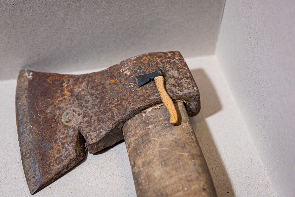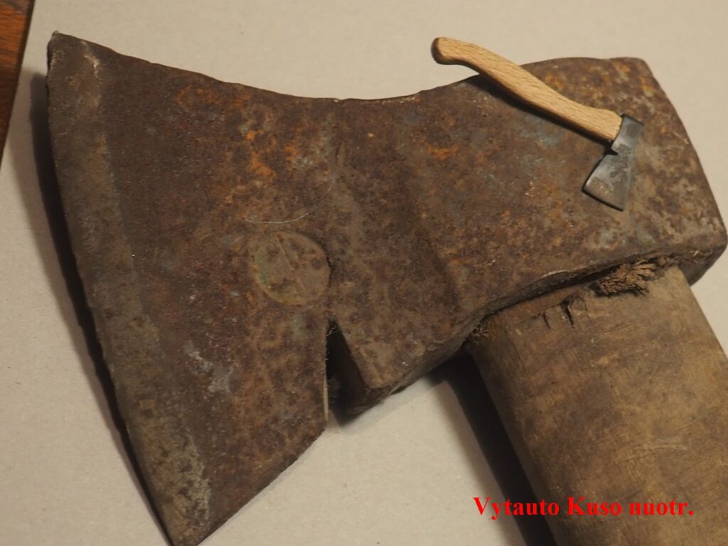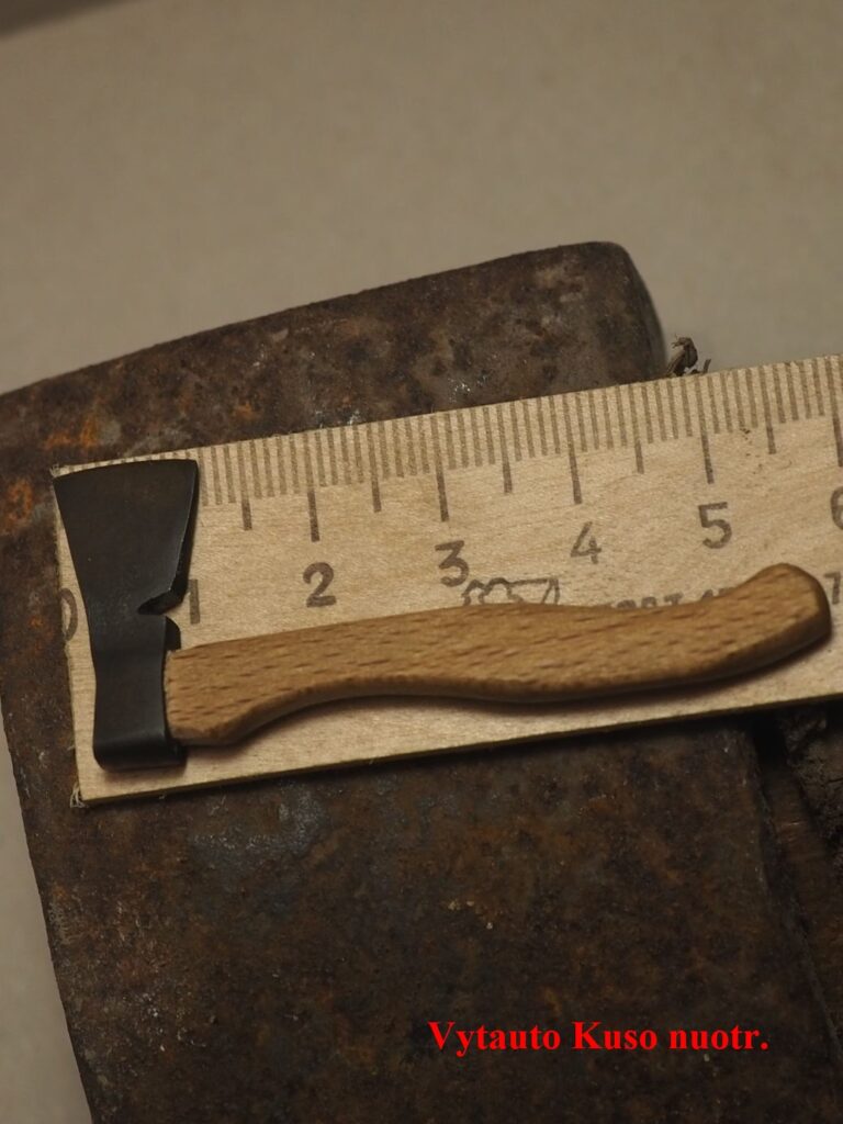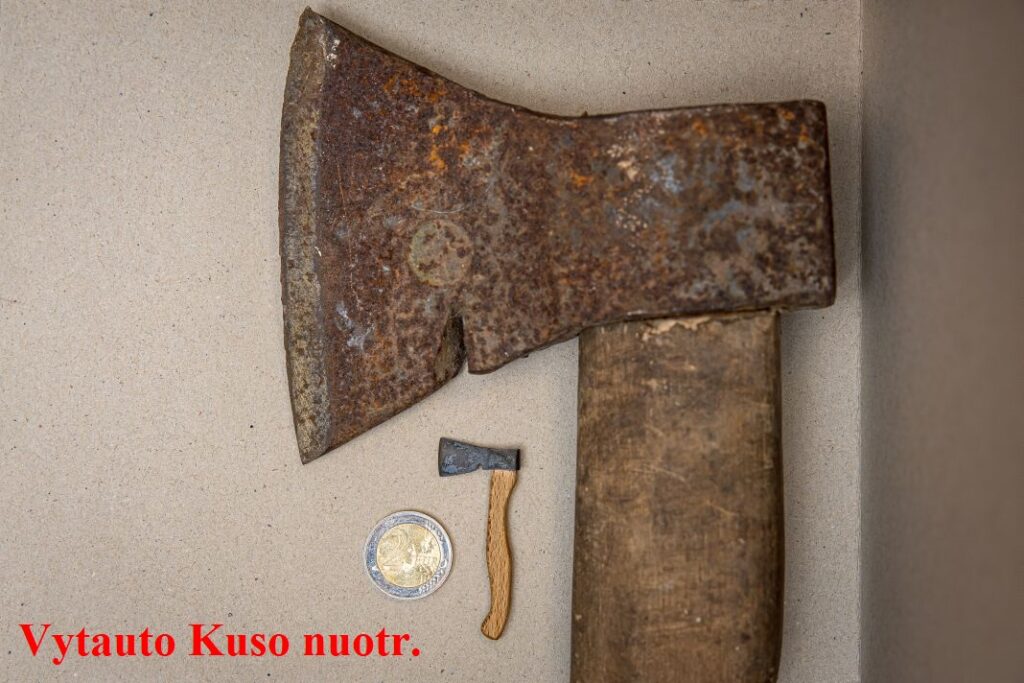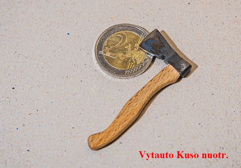 Mažiausias kirvis – 57 mm koto ilgio, 23 cm pentimi, 12 cm ašmenimis – padarytas palangiškio dailininko ir poeto Vytauto Kuso 2023 m. yra iš grūdinto metalo su mediniu kotu.