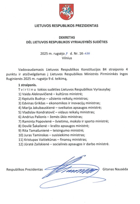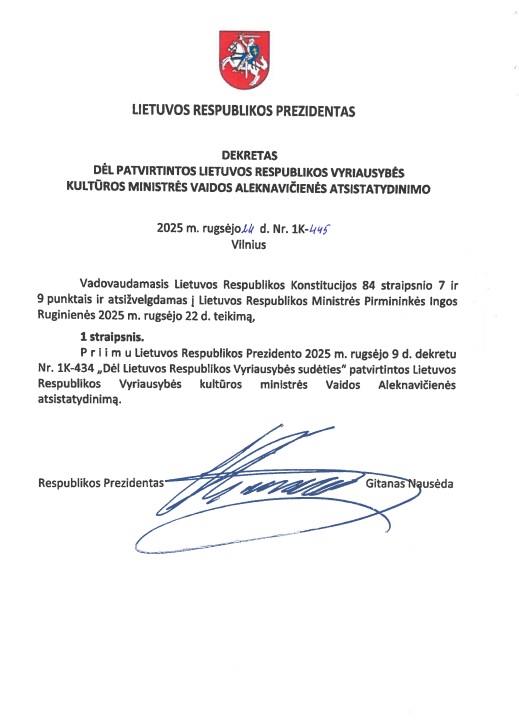 Trumpiausias paskirtosios kultūros ministrės laikotarpis – 11 dienų. Vaida Aleknavičienė, Lietuvos socialdemokratų partijos siūlymu, 2025 m. rugsėjo 9 d. Respublikos Prezidento dekretu dėl Lietuvos Respublikos Vyriausybės sudėties buvo patvirtinta kultūros ministre. 2025 m. rugsėjo 22 d. Respublikos Prezidento kanceliarijoje buvo gautas V. Aleknavičienės atsistatydinimo prašymas, tačiau 2025 m. rugsėjo 24 d. ji buvo atleista ne savo prašymu, o Ministrės Pirmininkės Ingos Ruginienės 2025 m. rugsėjo 22 d. teikimu. V. Aleknavičienė iki atleidimo neprisiekė Seime ir nepradėjo eiti kultūros ministrės pareigų.